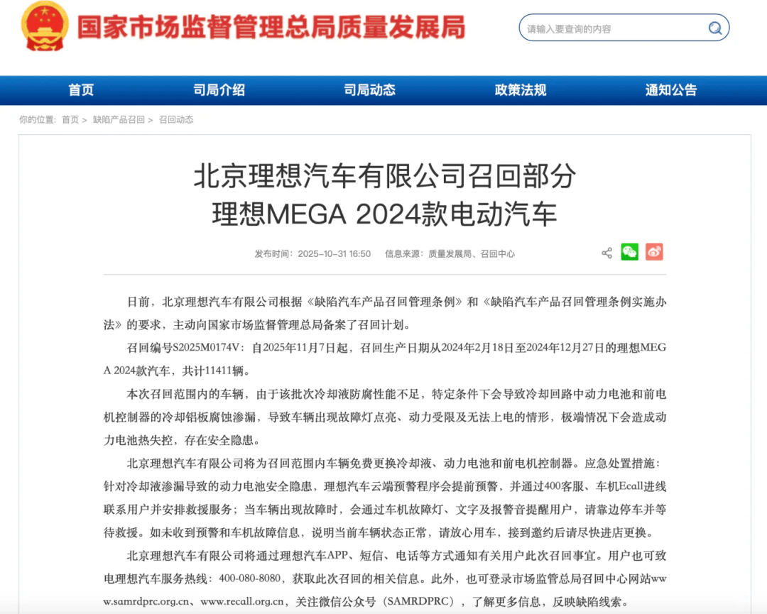 上周,理想突然发起主动召回。从本周开始,它将召回Mega 2024辆汽车,共计11,411辆。